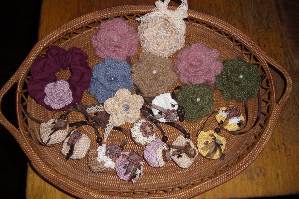 ※小さなバスケットのラベンダーポプリ・バラのシュシュ・バラのブローチ・バラのヘアゴム