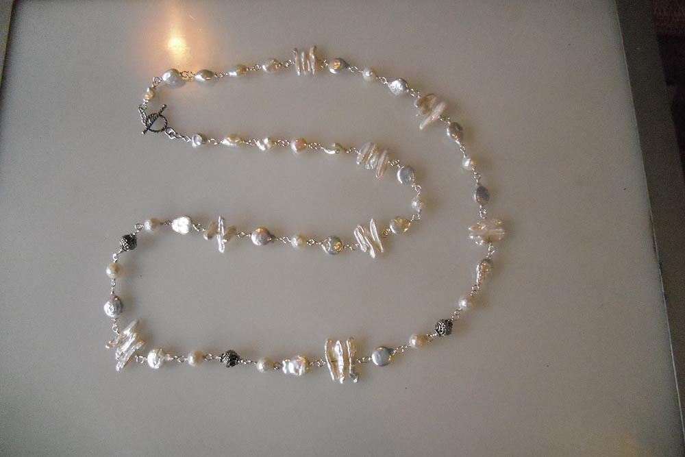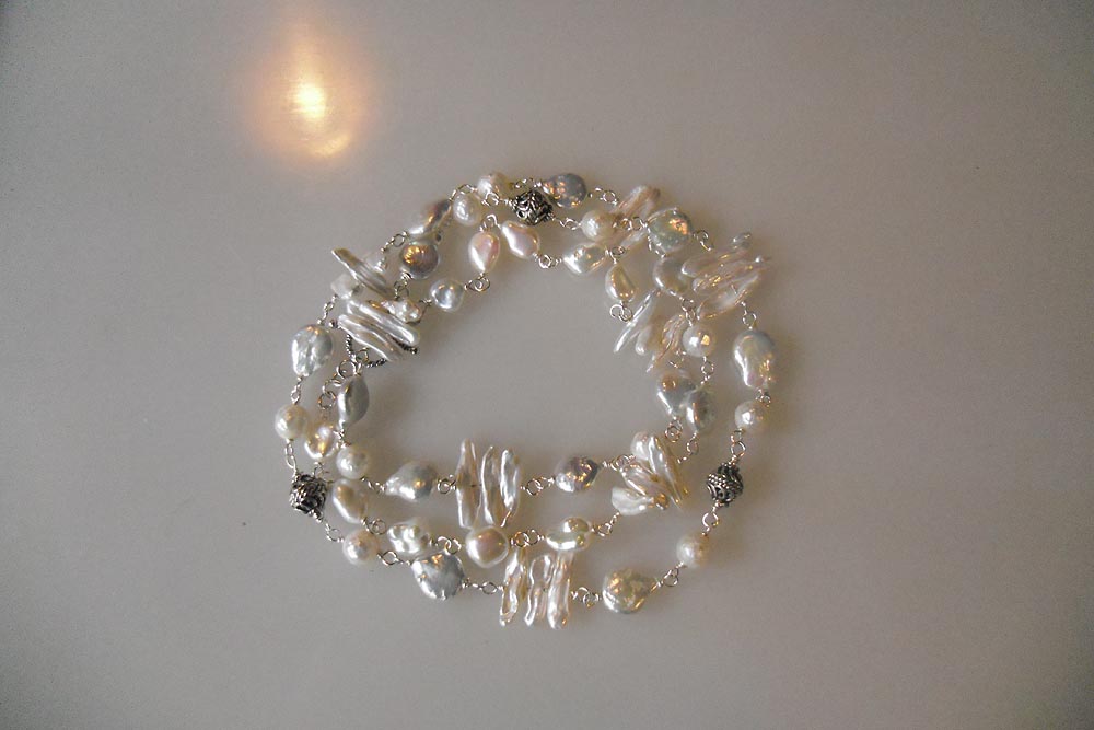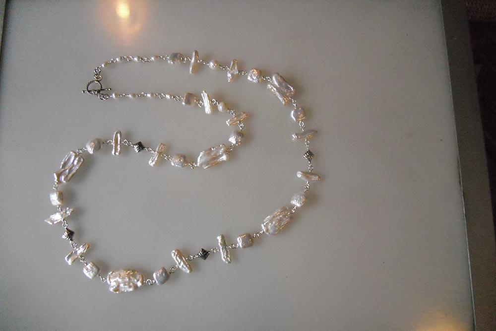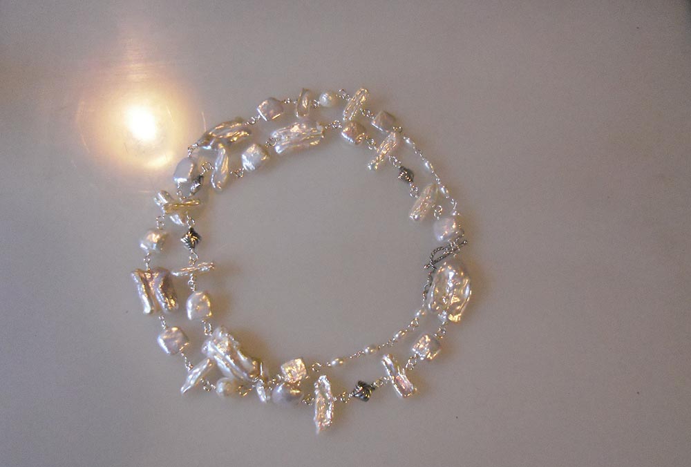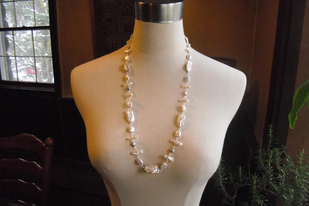 ◎やはり上質の淡水真珠をメガネ留めでつないだロングネックレスです。