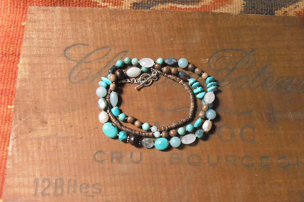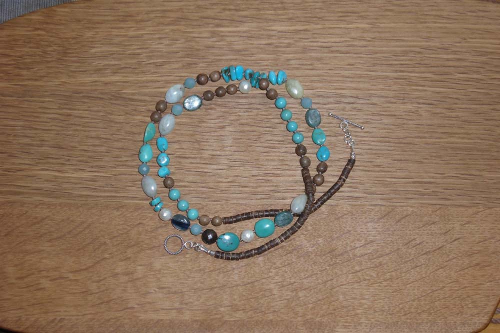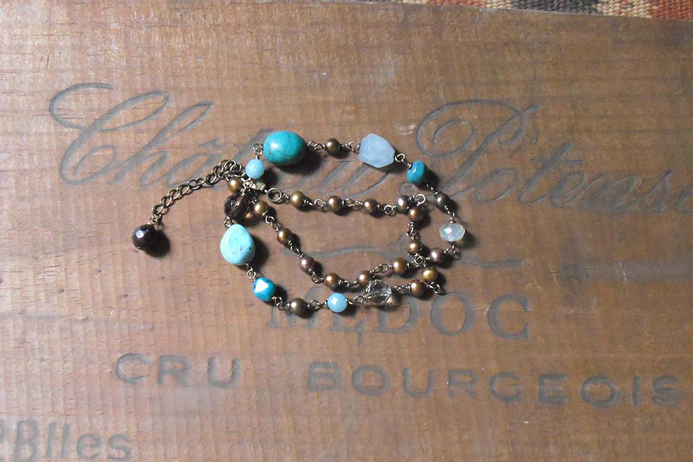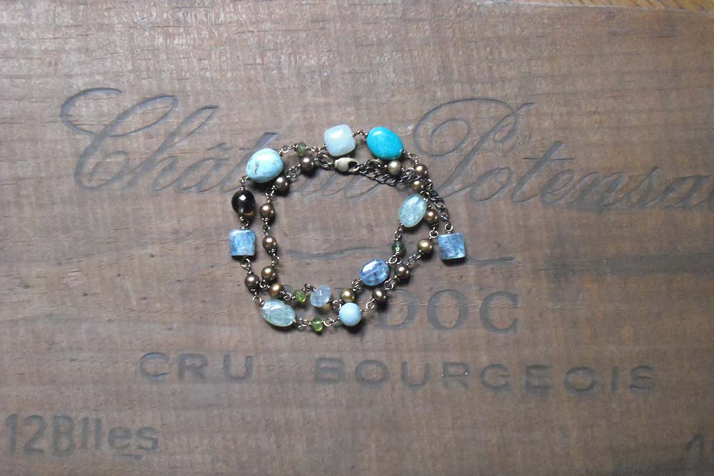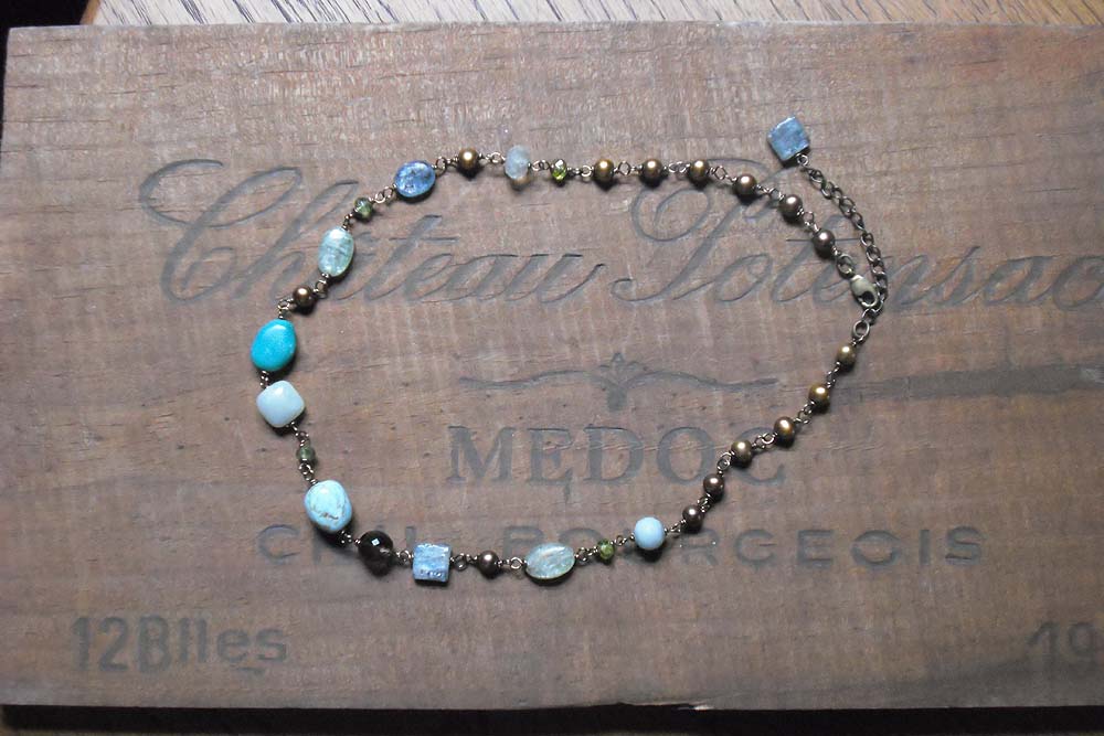 トルコ石・ブルーオパール・アクアマリン・アマゾナイトといったブルー系の石を茶系のスモーキークオーツや淡水真珠で引き締めたショートネックレス めがね留めでつないであります。