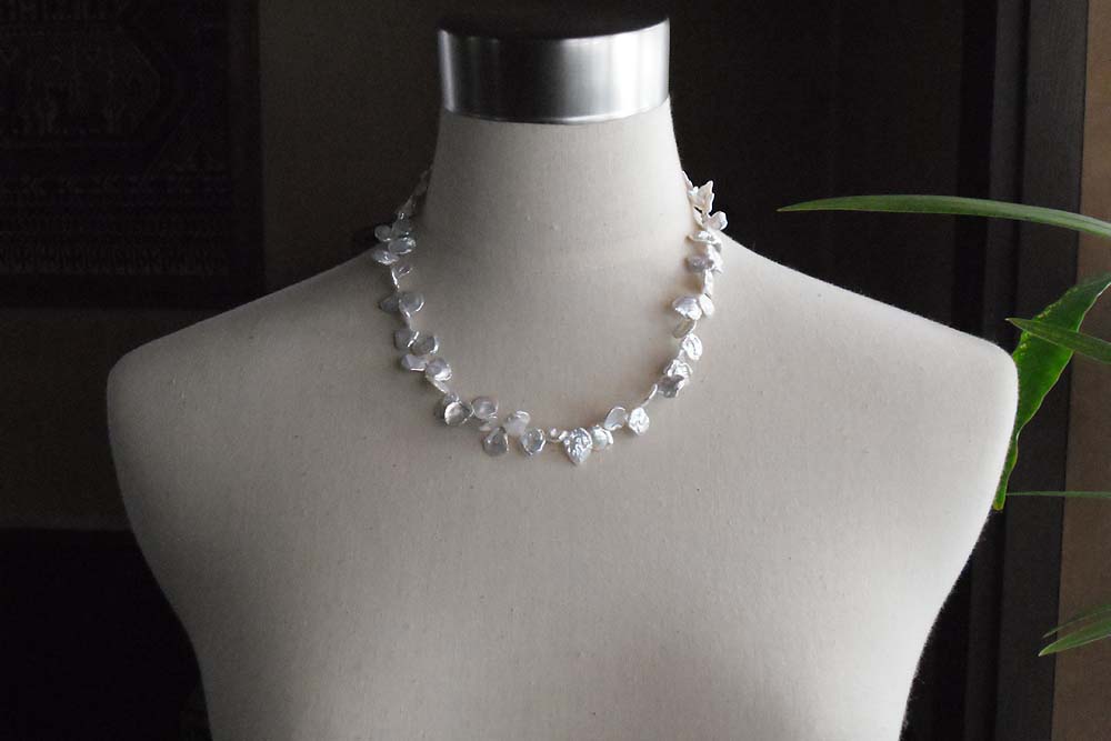 手持ちのシンプルな真珠のネックレスと組み合わせると、華やかになります。