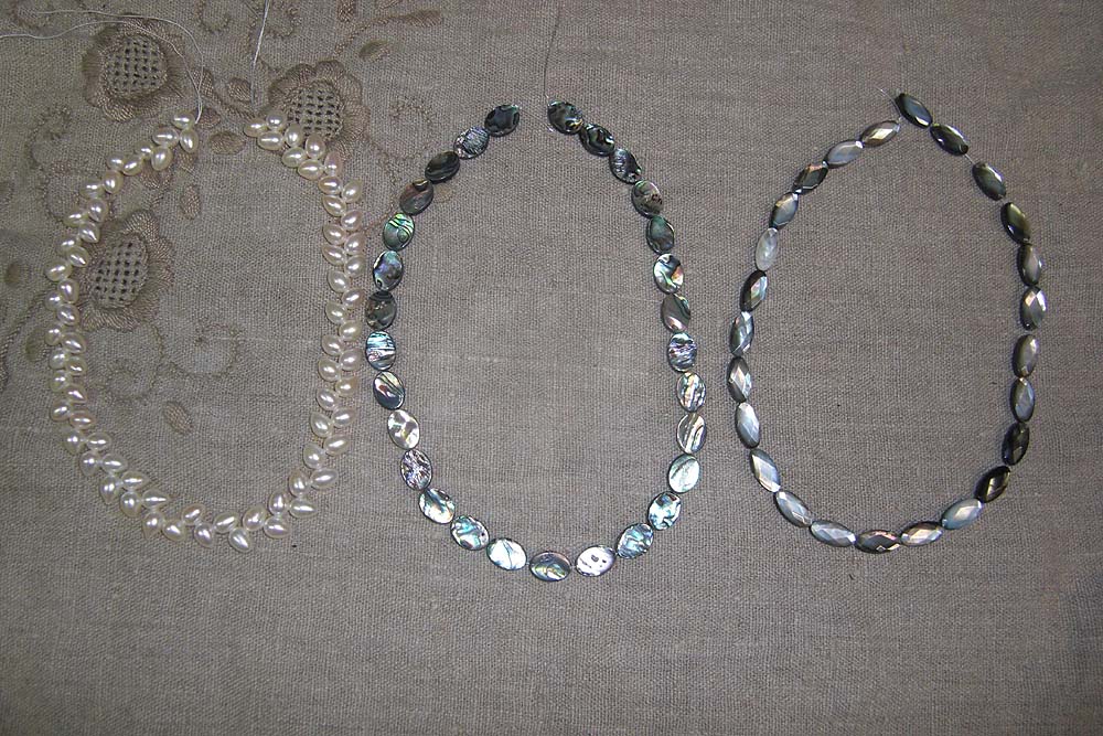 上 結晶付きのアゲート・淡水パール・黒蝶貝・アバロン(アワビ)・