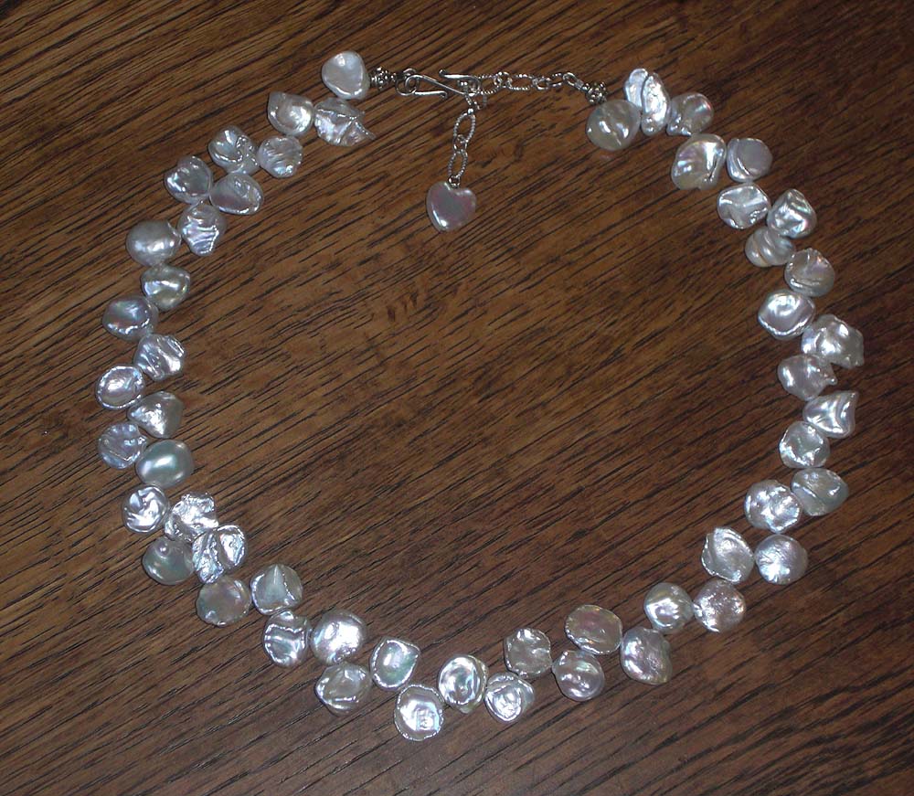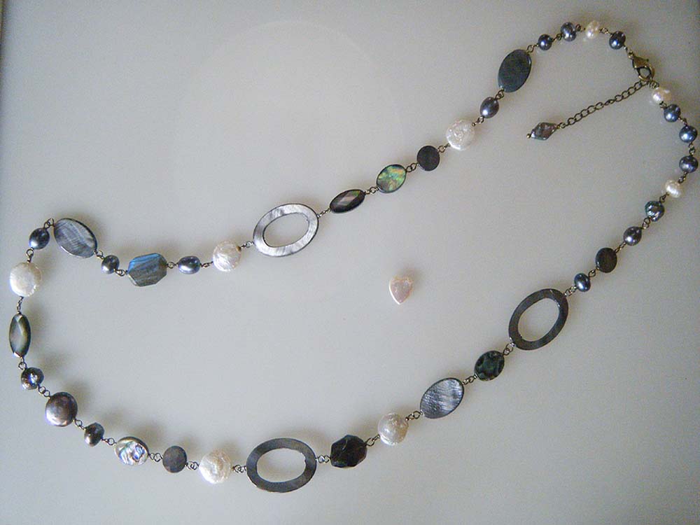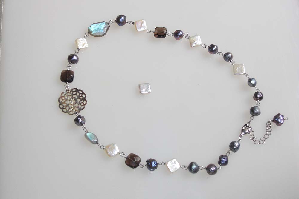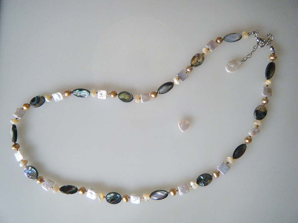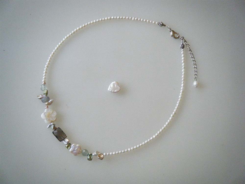中 ラブラドライトの2mmのネックレスに白蝶貝のレースのようなパーツと淡水パール・しずく