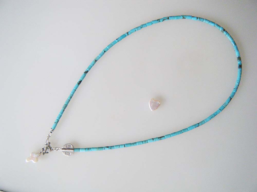 下 トルコ石のチューブのネックレスにシルバー925の留め具と淡水パール・クロス