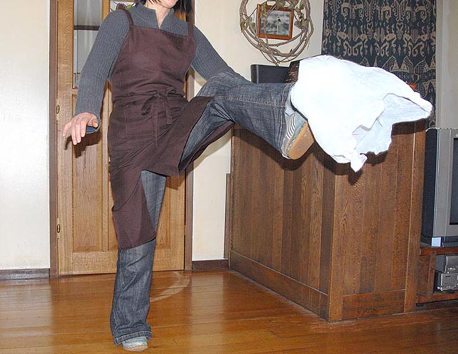※写真はコンビニの袋をけって腹筋を鍛える運動。