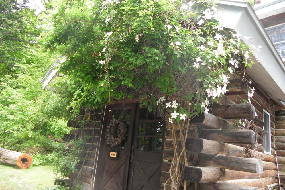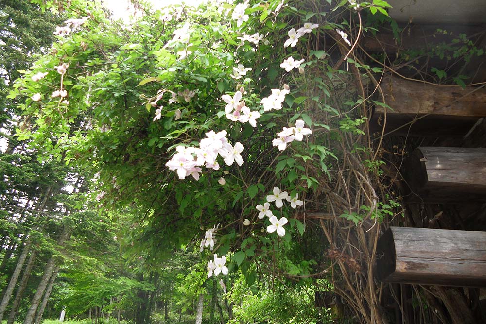 ※玄関の野バラにからんだピンクのクレマチスモンタナの花が咲き始めました。