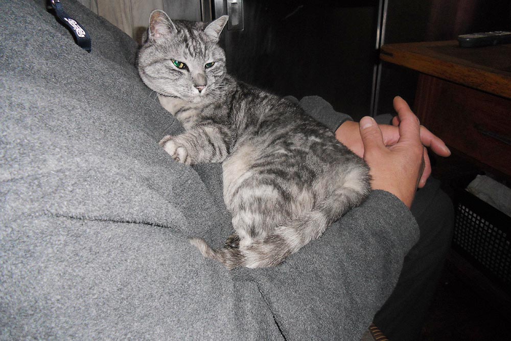 マオちゃんは外から帰ってくると足が冷たいので、すぐにエノさんの膝に飛び乗ります。