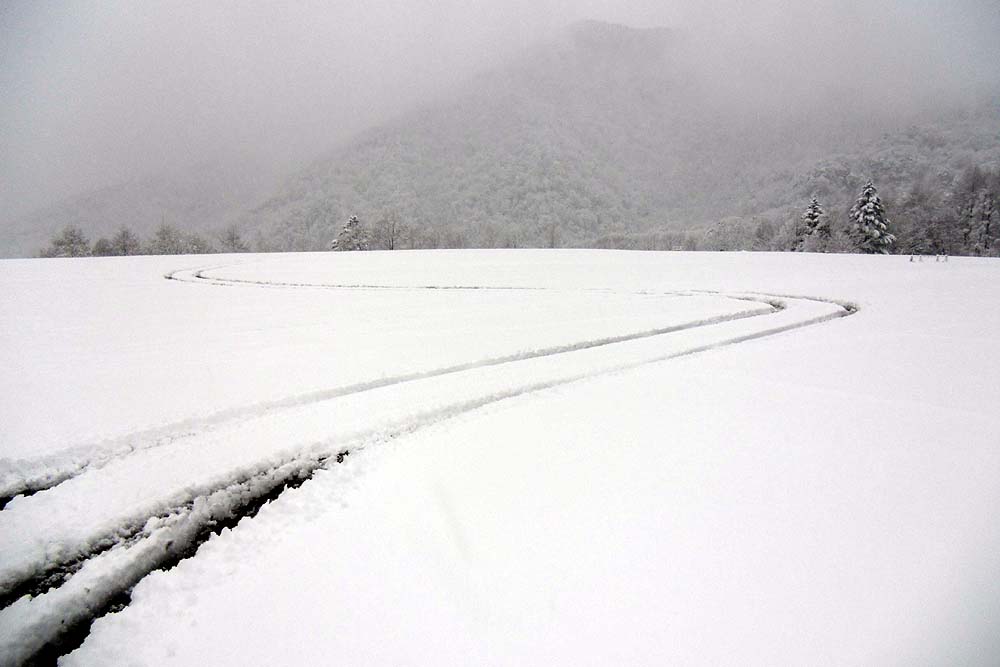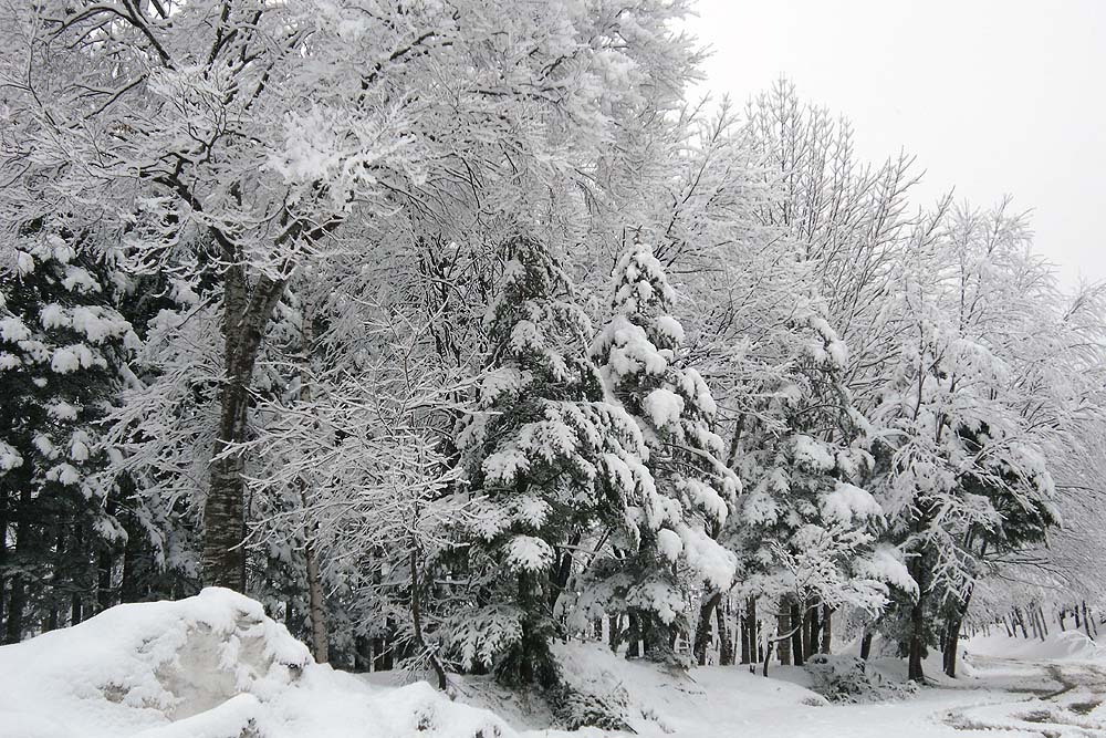※丸沼は雨が雪に変わっていました、ものすごく湿った雪がべったり木々に積もっています、