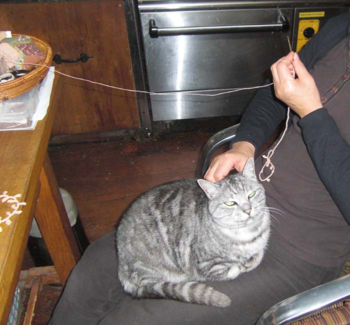 今度は、動くレース糸が面白くて、噛み付こうとするし、