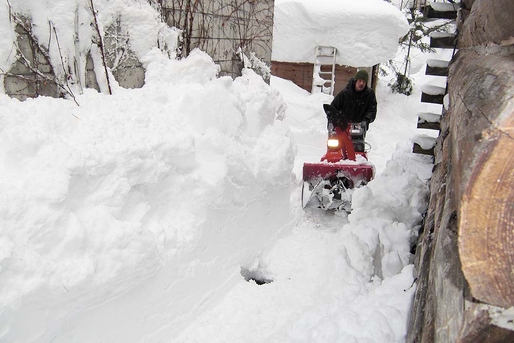 スコップで切り崩しては雪を飛ばす、