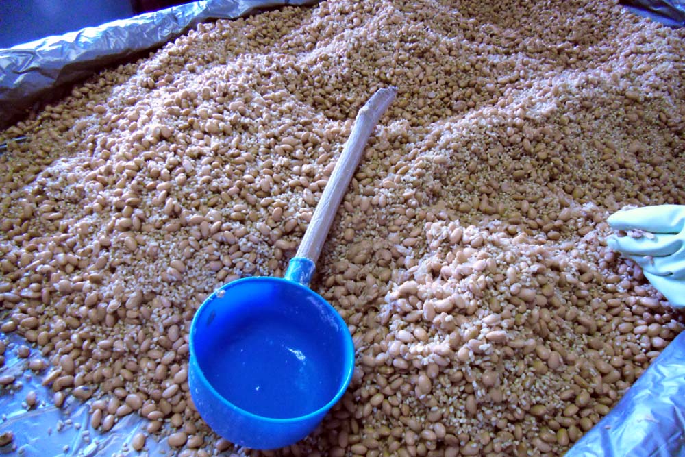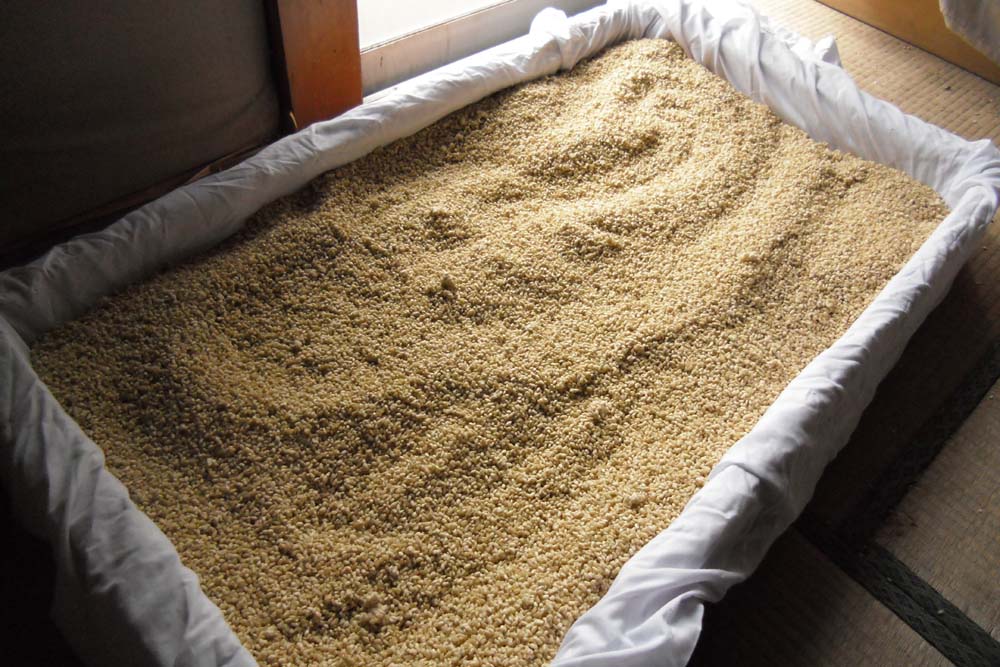 ③玄米と麹菌を良く混ぜあわせ、電熱線を張り巡らした部屋で一晩発酵させます。
