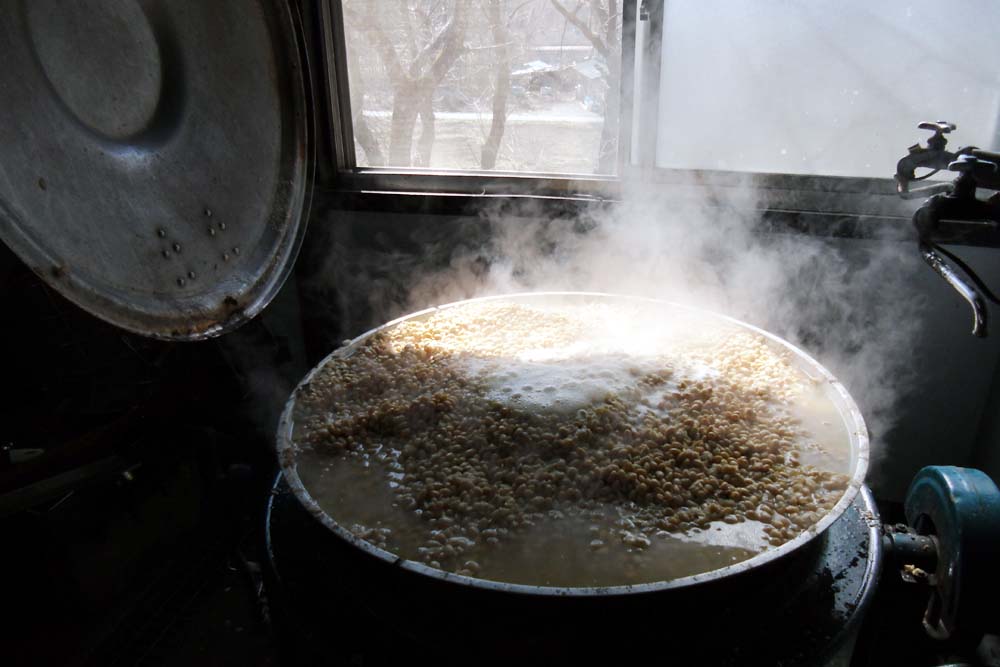 ⑤朝5時からカヲル社長が大釜で大豆を柔らかく煮上げておいてくれました。