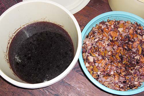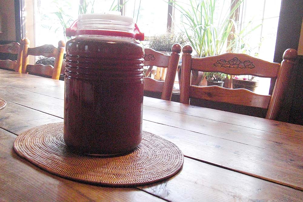 採ってきた山葡萄を1kgいれたので、きれいなワインレッドの