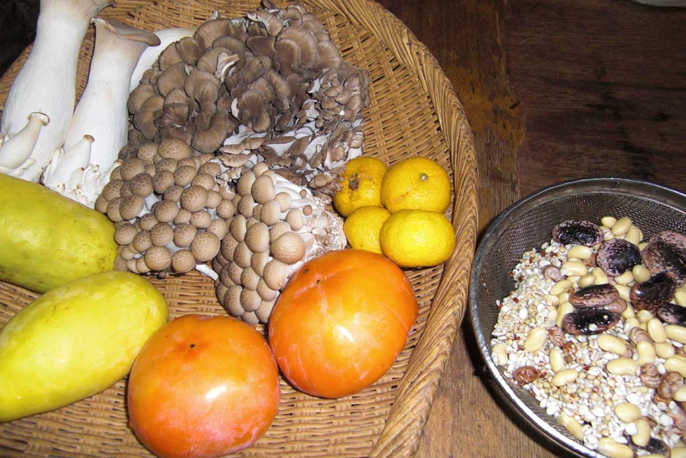 秋に実る果物や木の実、根菜類、玄米や雑穀、豆類,キノコ類