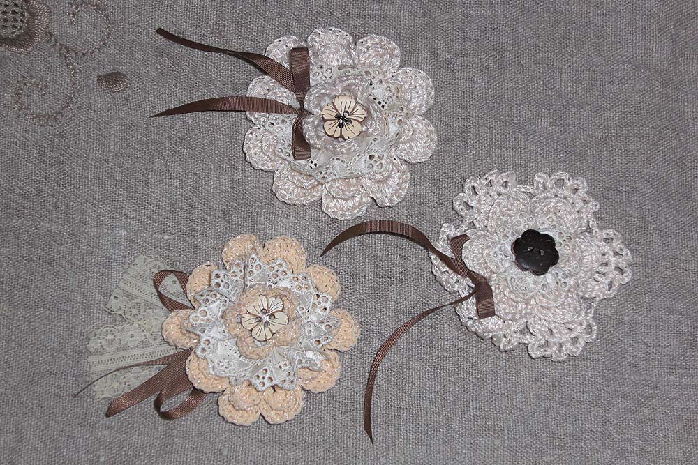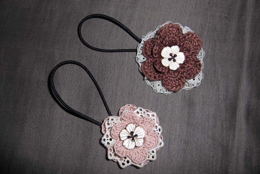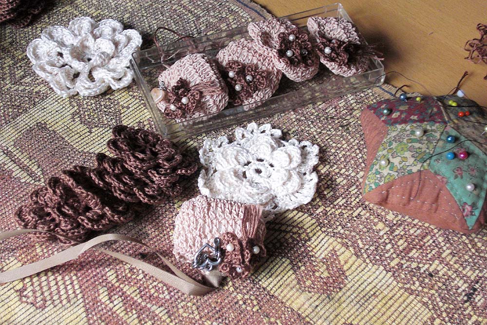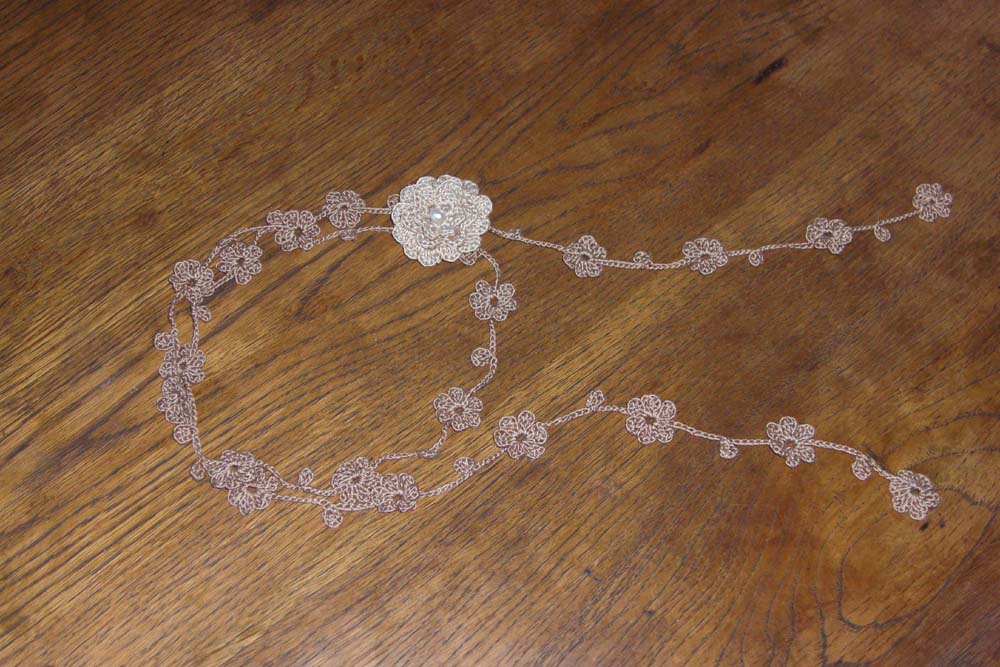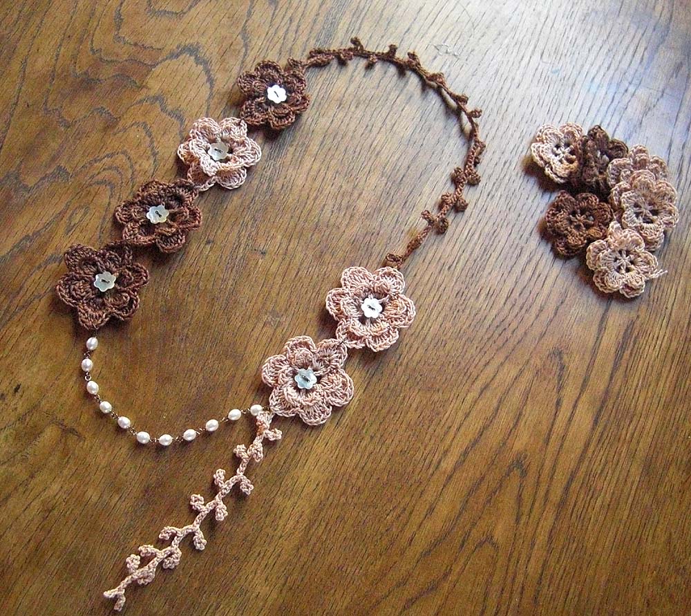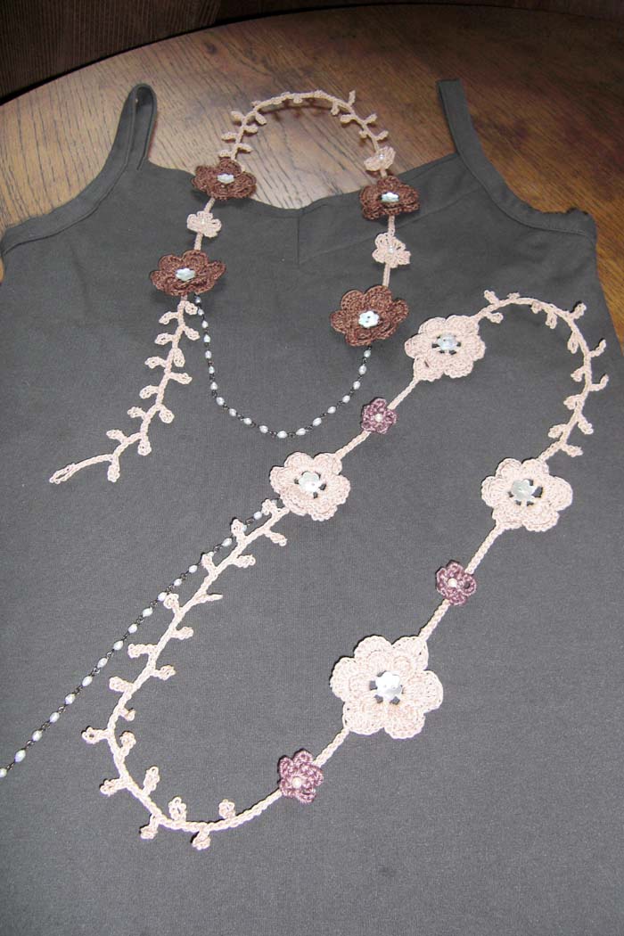 ※写真は130cmの花のラリエットと直径5cmの花のブローチです。