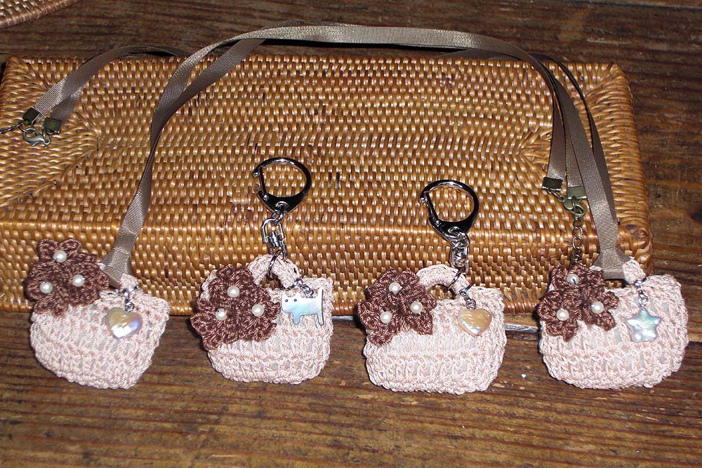 リボンをつけたネックレスとキーホルダー、バッグチャームの完成。