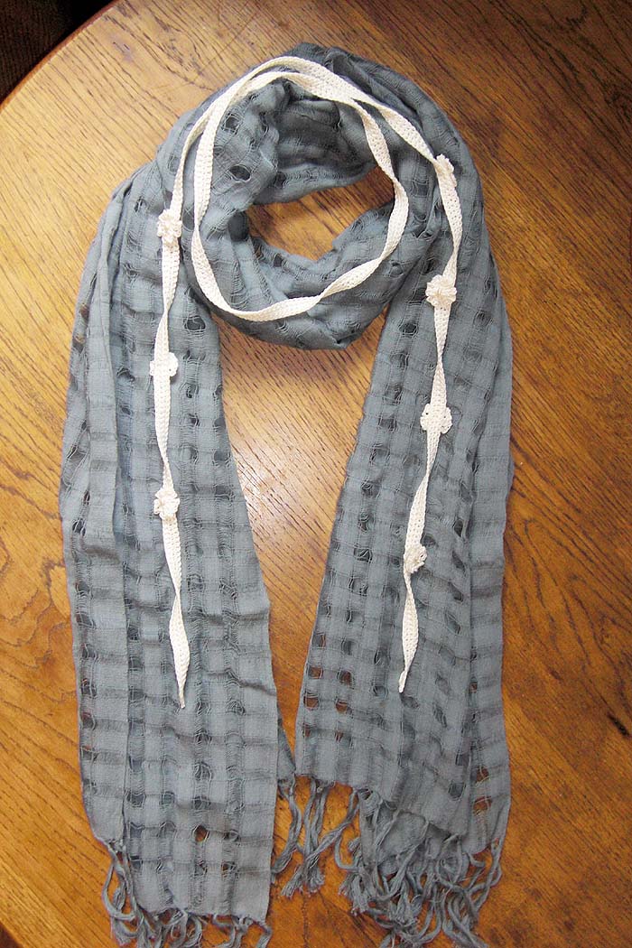 コットンやリネンなどの柔らかいストールと一緒に巻いてもOK。