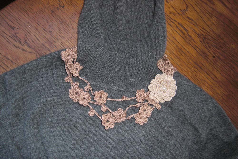 ※写真は130cmの花のラリエットと直径5cmの花のブローチです。