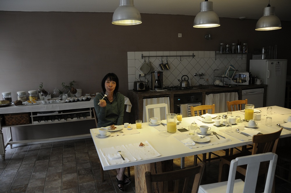 朝食はマダム心づくしのケーキやパン果物。クレームブリュレ、ヨーグルト、お米のおかゆなど、