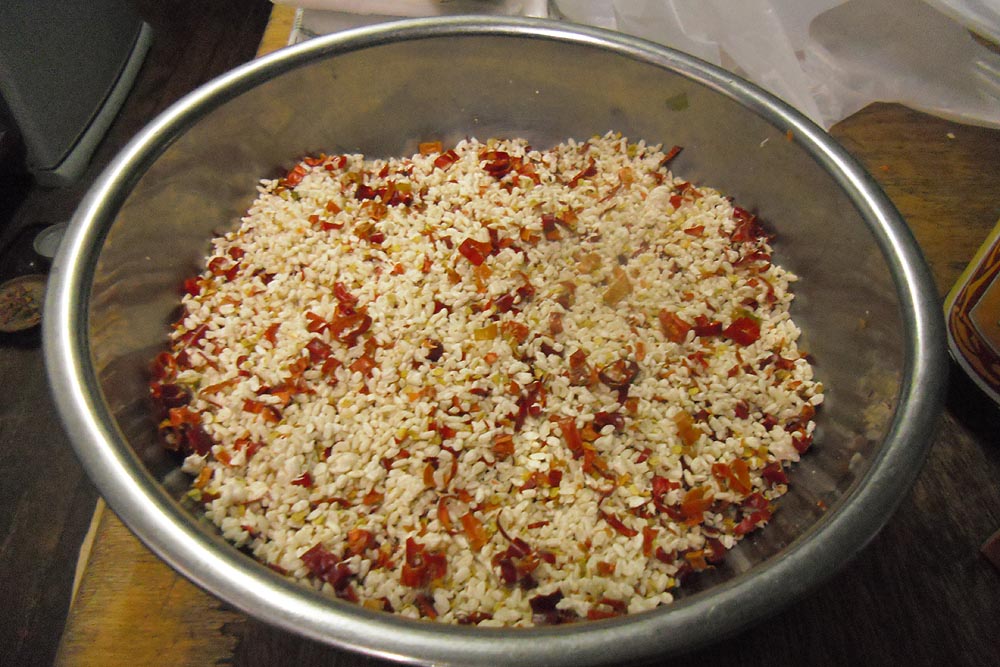 ボールに入れた糀をよく手で揉んで、塩を加えてまたもんで、