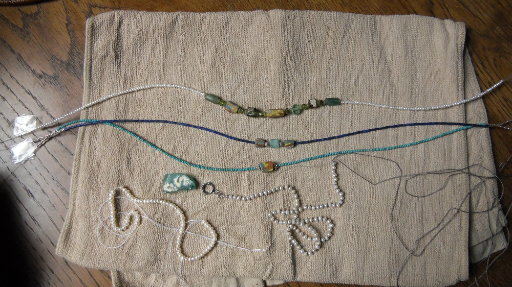 淡水真珠の3mmを絹糸で1つずつ結んでロングネックレスに