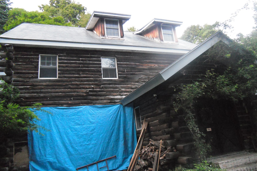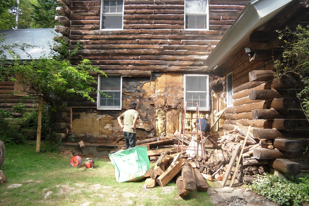 雨と雪の湿気でボロボロになった、ログのサイデング。