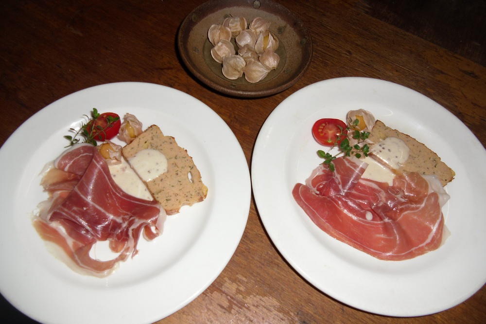 ※この日の前菜・食用ほうずき・生ハムとテリーヌ自家製マヨネーズのソースとともに。