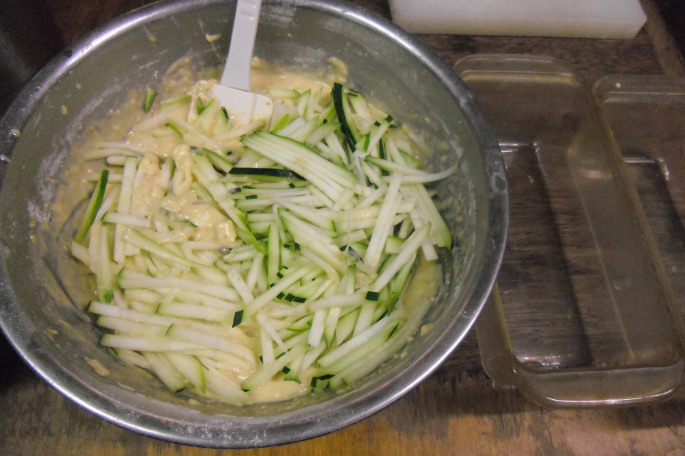 ③そこに振るった小麦粉を入れ、混ざったら、ズッキーニを入れざっくり混ぜる。